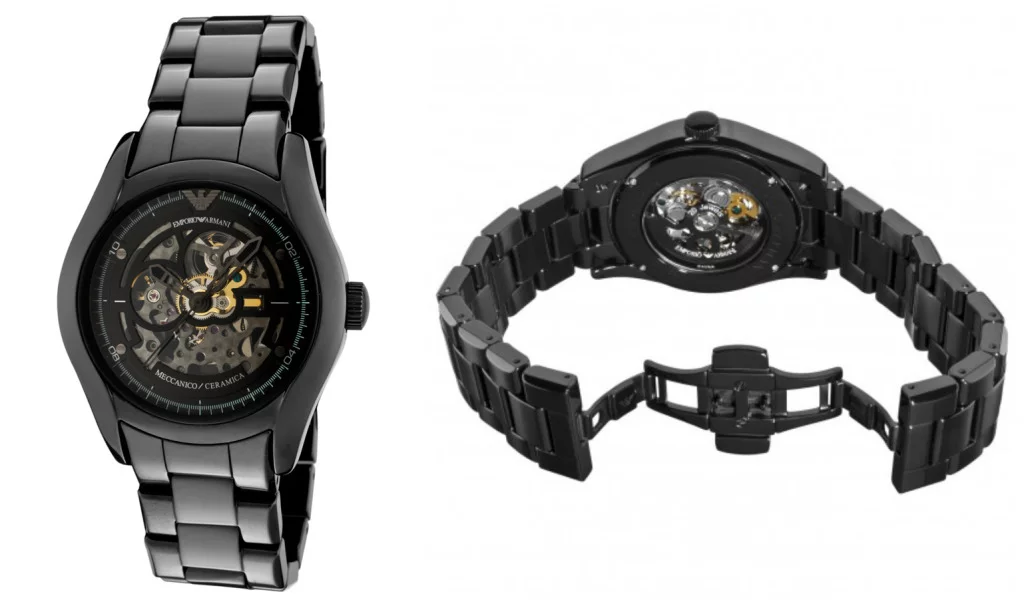 This is Armani’s Ceramic Black Skeleton Dial Watch, Both the case and the bracelet are made of ceramic rather than stainless steel, as is the norm. The all-black case and bracelet make a bold and powerful statement and the skeletonized dial adds an element of visual interest, as well as allowing the wearer to witness the intricate movements of their timepiece.
