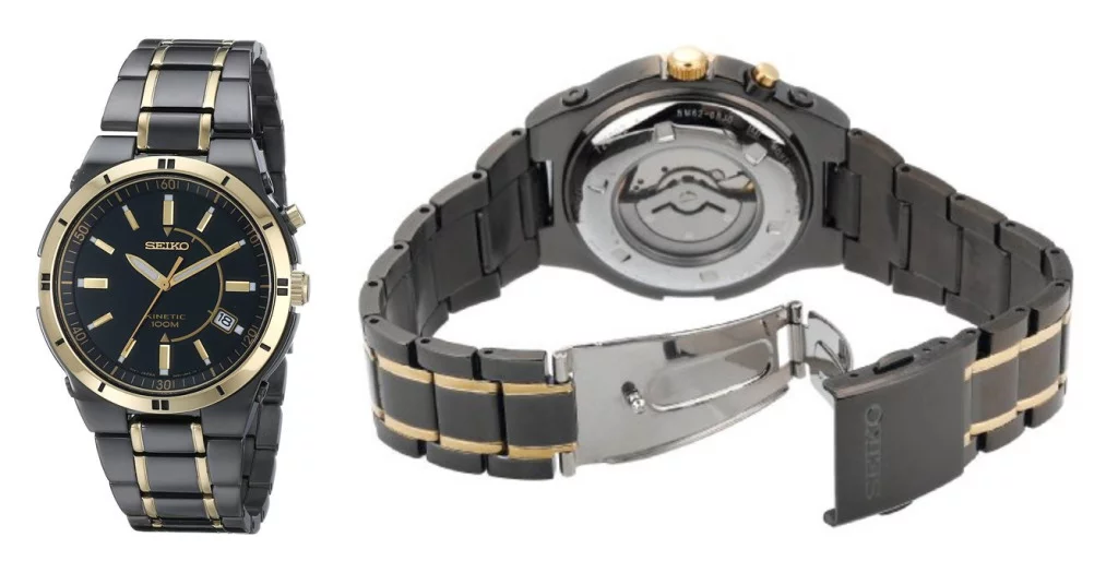 This is Seiko’s Stainless Steel Two-Tone Kinetic Dress Watch, It requires no battery as it is powered by the kinetic energy generated by arm movement. The watch face is protected by Hardlex crystal and water-resistant to 330ft, making it exceptionally durable for such a low-priced dress watch. The design is classic, though the two-tone detailing ensures that it does not look too traditional.