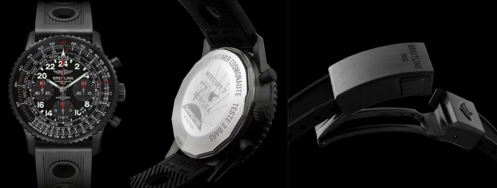 This is the Navitimer Cosmonaute. It was originally developed at the request of astronaut Scott Carpenter in 1961. Carpenter and his fellow astronauts in the Mercury space program needed a watch with a 24-hour dial because there is no differentiation between night and day in space. This particular version is made of black steel with an ocean racer strap, but other styles are available.